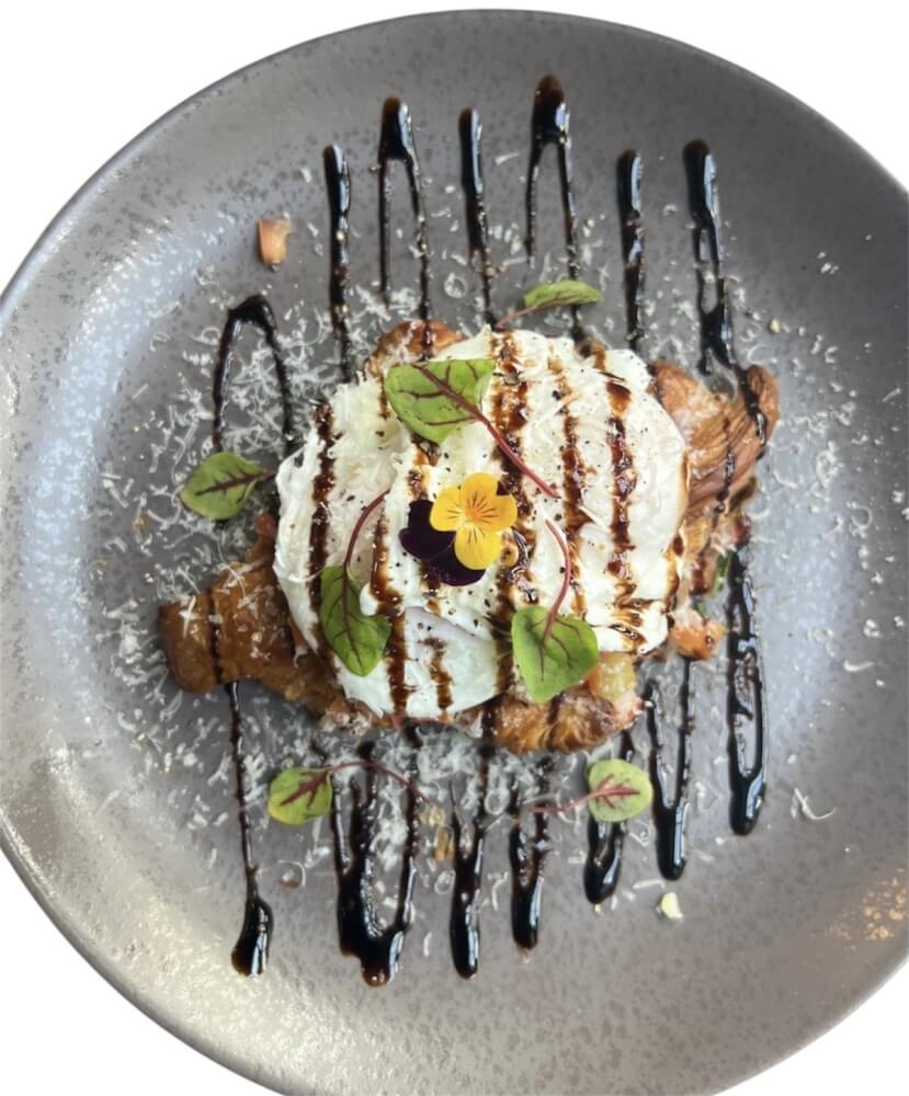 Tomato, onion salsa with basil vinaigrette w/ poached eggs served on buttered croissant topped with pecorino cheese and balsamic glaze
